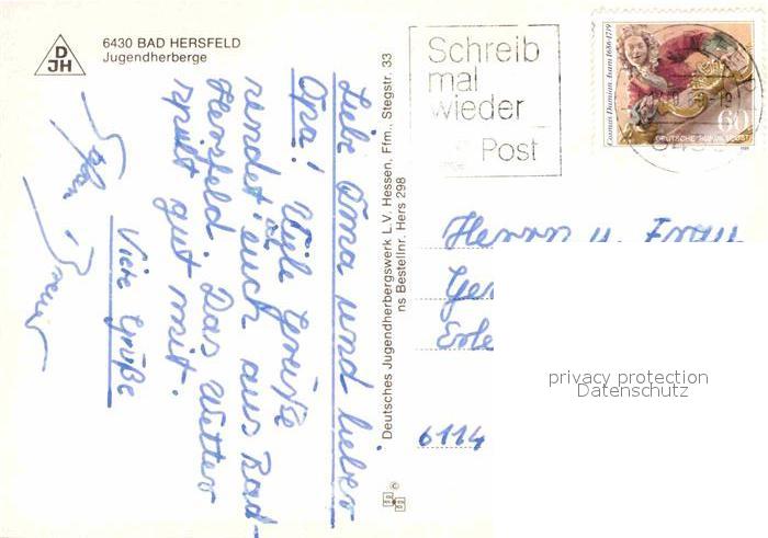 72797082 alte Postkarte Bad Hersfeld Jugendherberge Stiftsruine Rathaus Kirche postalisch gelaufen Erhaltung siehe scans [LiesaD40] KatCode: 11110006632002
