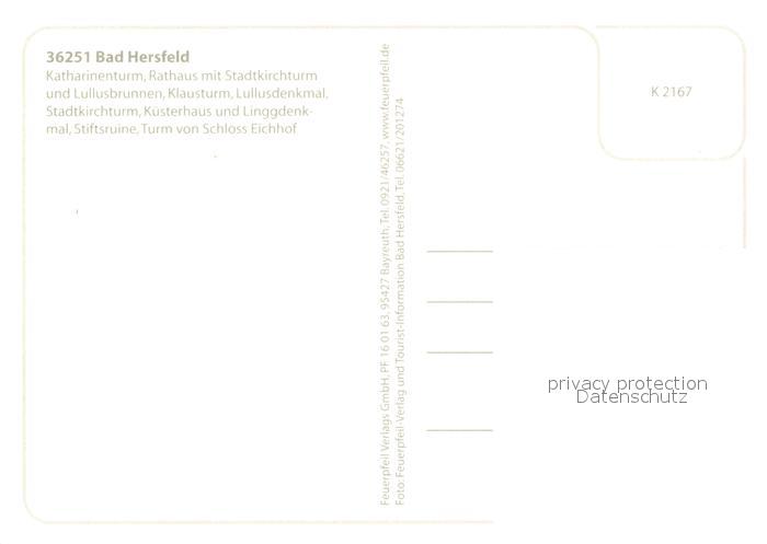 73212913 Bad Hersfeld Katharinenturm Rathaus Stadtkirchturm Lullusbrunnen Klausturm Lullusdenkmal Kuesterhaus und Linggdenk Stiftsruine Turm von Schloss Eichhof postalisch nicht gelaufen Erhaltung siehe scans [WerneD78] KatCode: 11110006632002