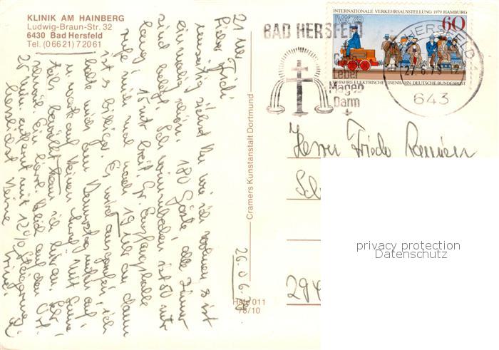 73758769 alte Postkarte Bad Hersfeld Klinik am Hainberg m. Hallenbad postalisch gelaufen Erhaltung siehe scans [LiesaD40] KatCode: 11110006632002