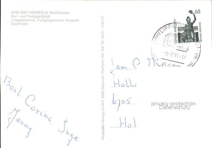 72287868 alte Postkarte Bad Hersfeld Linggdenkmal Kurpark Stadthalle postalisch gelaufen Erhaltung siehe scans KatCode: 11110006632002