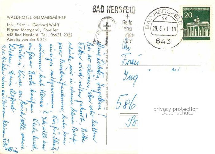 72783963 alte Postkarte Bad Hersfeld Waldhotel Glimmesmuehle postalisch gelaufen Erhaltung siehe scans [FriedD77] KatCode: 11110006632002