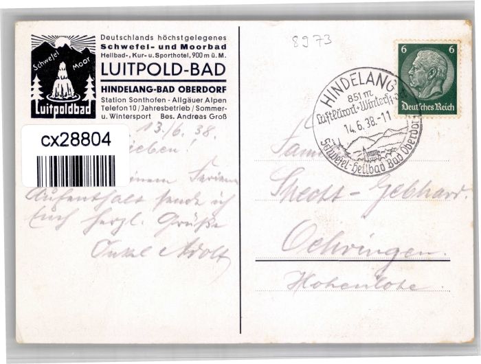 30910632 alte Postkarte Bad Hindelang Bad Oberdorf Luitpold-Bad postalisch gelaufen KatCode: 11110009780123