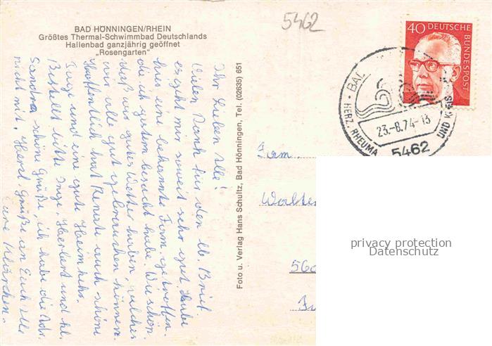74050257 alte Postkarte Bad Hoenningen Rosengarten Hallenbad postalisch gelaufen Erhaltung siehe scans [WerneD78] KatCode: 11110007138004