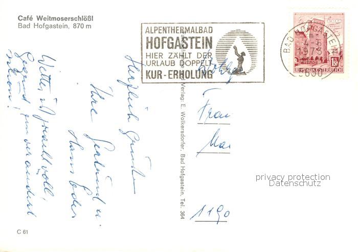 73161299 alte Postkarte Bad Hofgastein Cafe Weitmoserschloessl postalisch gelaufen Erhaltung siehe scans [KathaD81] KatCode: 11390322050402
