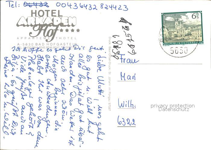 71914365 alte Postkarte Bad Hofgastein Hotel Arkadenhof postalisch gelaufen Erhaltung siehe scans KatCode: 11390322050402