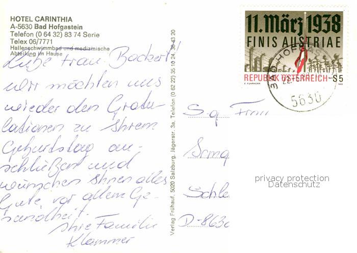 12637335 alte Postkarte Bad Hofgastein Hotel Carinthia postalisch gelaufen Erhaltung siehe scans [LiesaD40] KatCode: 11390322050402