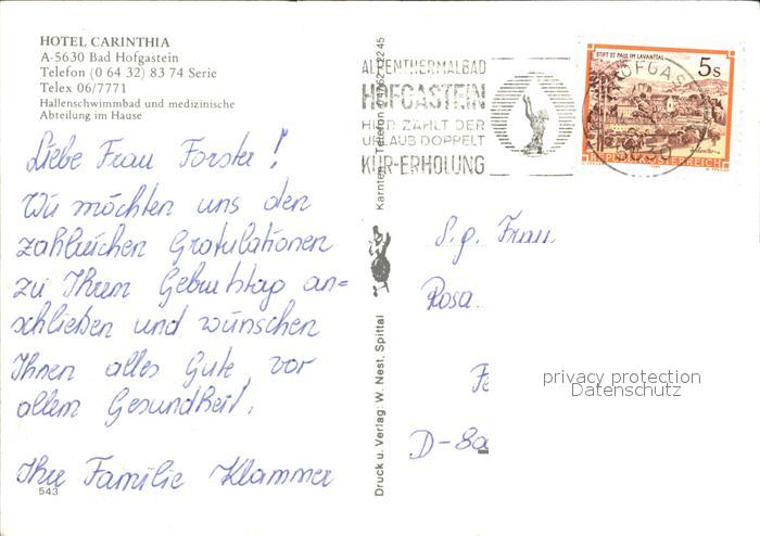 72436378 alte Postkarte Bad Hofgastein Hotel Carinthia postalisch gelaufen Erhaltung siehe scans KatCode: 11390322050402
