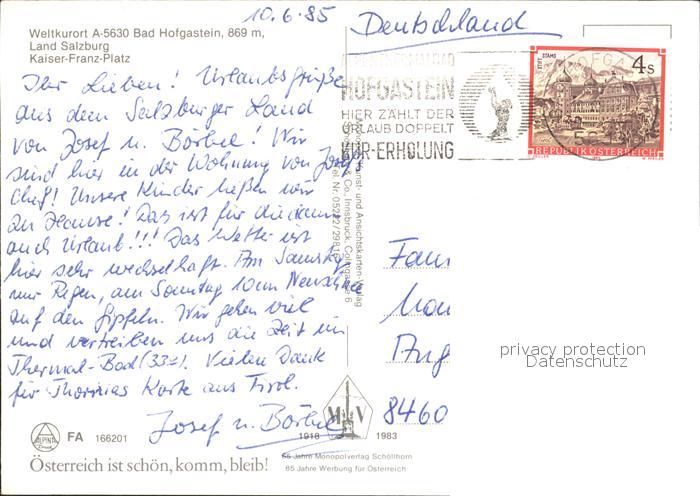 72240332 alte Postkarte Bad Hofgastein Kaiser Franz Platz Denkmal Salzburger Hof Hotel Kirchturm postalisch gelaufen Erhaltung siehe scans KatCode: 11390322050402