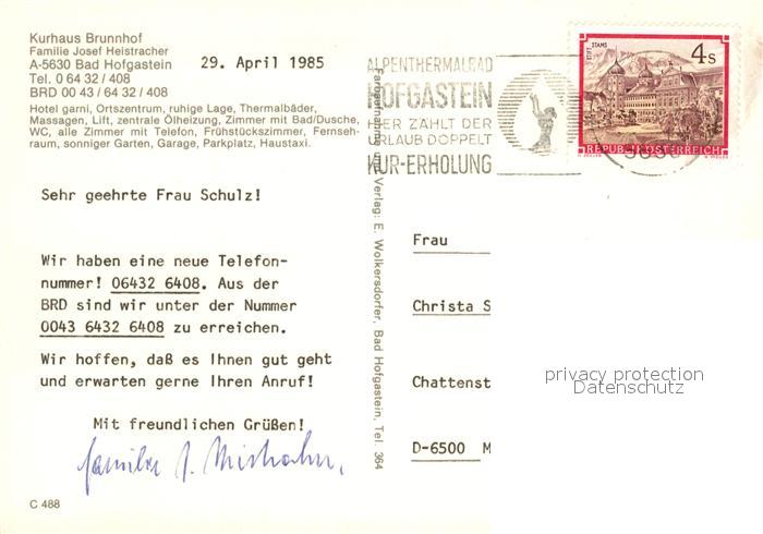 73048946 alte Postkarte Bad Hofgastein Kurhaus Brunnhof postalisch gelaufen Erhaltung siehe scans [KathaD81] KatCode: 11390322050402