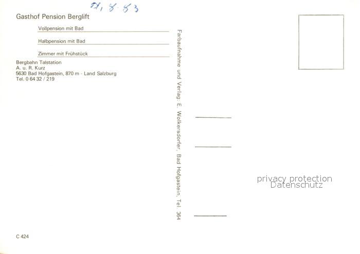 73588097 Bad Hofgastein Pension Berglift postalisch nicht gelaufen Erhaltung siehe scans [PaolaD17] KatCode: 11390322050402