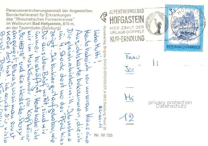 73231297 alte Postkarte Bad Hofgastein Pensionsversicherungsanstalt der Angestellten postalisch gelaufen Erhaltung siehe scans [LiesaD40] KatCode: 11390322050402
