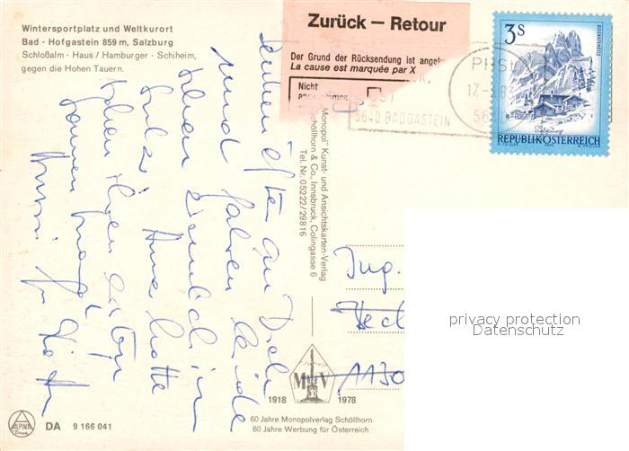 73264973 alte Postkarte Bad Hofgastein Schlossalm Haus Hamburger Schiheim mit Hohen Tauern postalisch gelaufen Erhaltung siehe scans [WerneD78] KatCode: 11390322050402