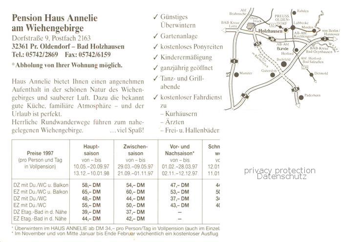73858897 Bad Holzhausen Luebbecke Preussisch Oldendorf NRW Pension Haus Annelie Terrasse Gastraum Zimmer Ponyreiten postalisch nicht gelaufen Werbekarte (keine Postkarte) Erhaltung siehe scans [WerneD78] KatCode: 11110005770036