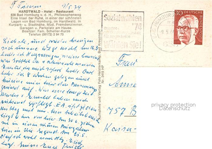 73814924 alte Postkarte Bad Homburg Hardtwald Hotel Restaurant postalisch gelaufen Erhaltung siehe scans [WerneD78] KatCode: 11110006434001