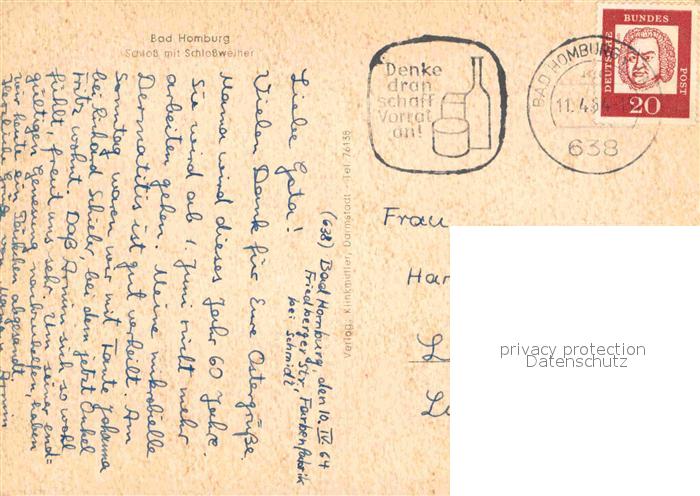 72897027 alte Postkarte Bad Homburg Schloss Schlossweiher postalisch gelaufen Erhaltung siehe scans [KathaD81] KatCode: 11110006434001