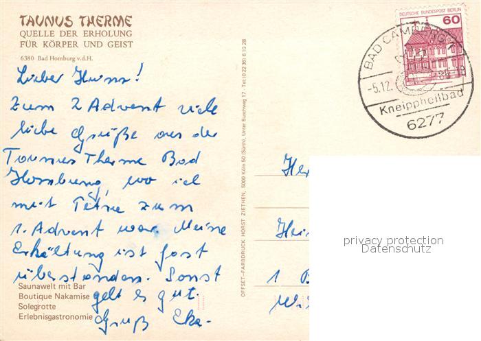 73544772 alte Postkarte Bad Homburg Taunus Therme Saunawelt mit Bar Boutique Nakamise Solegrotte Erlebnisgastronomie postalisch gelaufen Erhaltung siehe scans [WerneD78] KatCode: 11110006434001