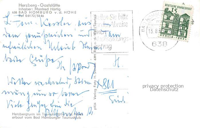 74153057 alte Postkarte BAD HOMBURG von der Hoehe Hessen Herzberg-Gaststaette Aussichtsturm Herzbergturm postalisch gelaufen Erhaltung siehe scans [FriedD77] KatCode: 11110006434001