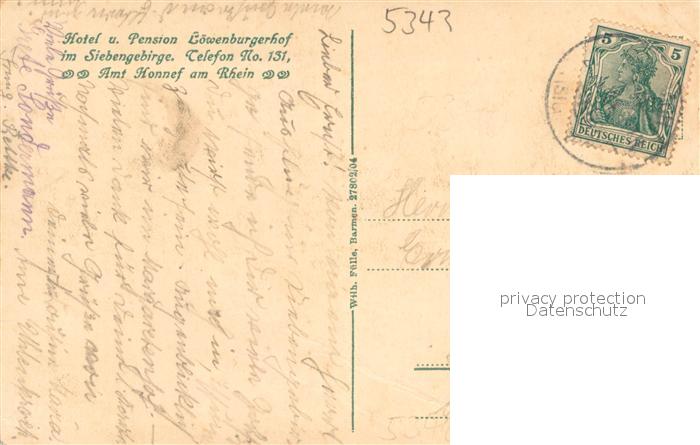 73693524 alte Postkarte Bad Honnef Hotel und Pension Loewenburgerhof Loewenburg im Siebengebirge postalisch gelaufen Erhaltung siehe scans [LiesaD40] KatCode: 11110005382008