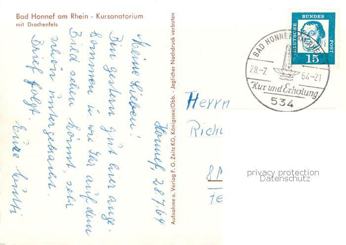 73801092 alte Postkarte Bad Honnef Kursanatorium mit Drachenfels postalisch gelaufen Erhaltung siehe scans [WerneD78] KatCode: 11110005382008