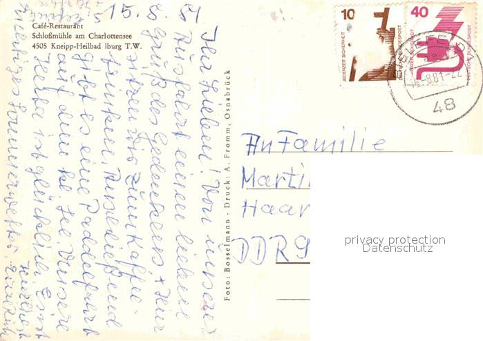72687223 alte Postkarte Bad Iburg Cafe Restaurant Schlossmuehle am Charlottensee postalisch gelaufen Erhaltung siehe scans [WerneD78] KatCode: 11110003459004