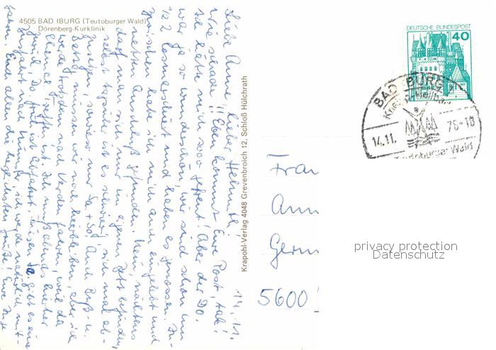 72900000 alte Postkarte Bad Iburg Doerenberg-Kurklinik postalisch gelaufen Erhaltung siehe scans [NatalD47] KatCode: 11110003459004