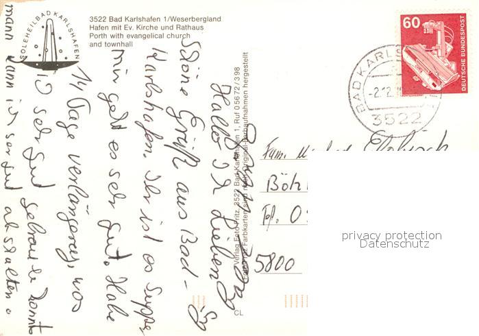 73214176 alte Postkarte Bad Karlshafen Hafen Promenade Kirche Rathaus postalisch gelaufen Erhaltung siehe scans [FriedD77] KatCode: 11110006633002