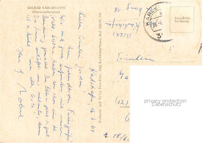 73805029 alte Postkarte Bad Karlshafen Hugenottensiedlung Schwimmbad Ortspartie postalisch gelaufen Erhaltung siehe scans [FriedD77] KatCode: 11110006633002