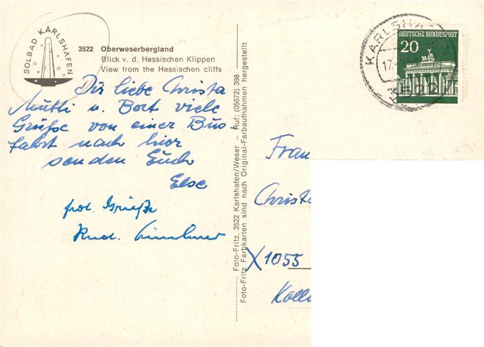 73945930 alte Postkarte Bad Karlshafen Panorama Blick von den Hessischen Klippen postalisch gelaufen Erhaltung siehe scans [FriedD77] KatCode: 11110006633002