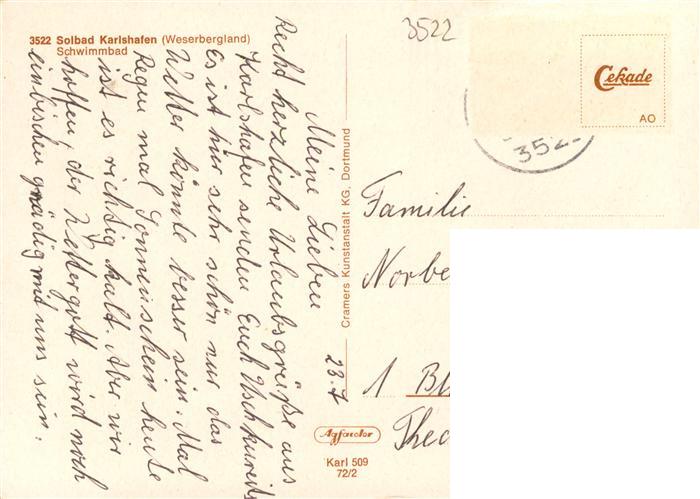 73935678 alte Postkarte Bad Karlshafen Schwimmbad postalisch gelaufen Erhaltung siehe scans [FriedD77] KatCode: 11110006633002