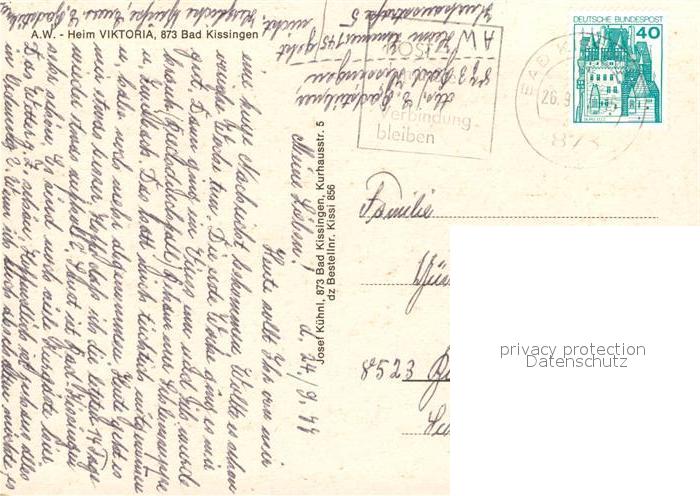 73230339 alte Postkarte Bad Kissingen A.W. Heim Viktoria Kurhotel Park Fontaene Postkutsche Vierspaenner Wappen postalisch gelaufen Erhaltung siehe scans [FriedD77] KatCode: 11110009672114
