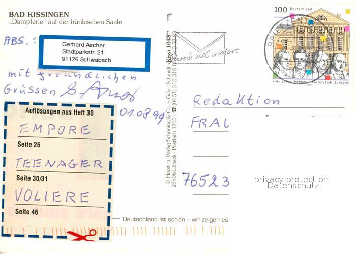 72720659 alte Postkarte Bad Kissingen Dampferle fr?nkische Saale postalisch gelaufen Erhaltung siehe scans [KathaD79] KatCode: 11110009672114
