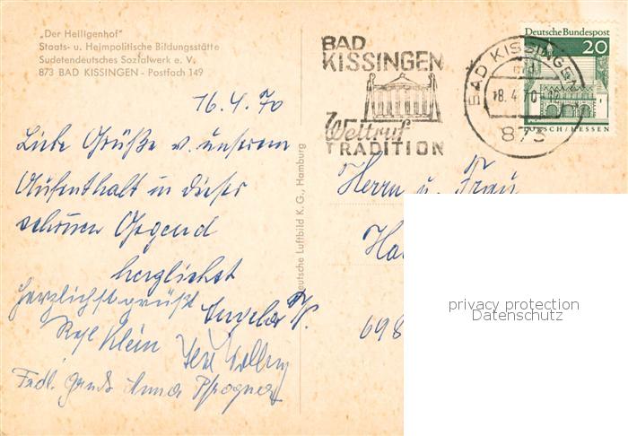 73874277 alte Postkarte Bad Kissingen Der Heiligenhof Fliegeraufnahme postalisch gelaufen Erhaltung siehe scans [WerneD78] KatCode: 11110009672114