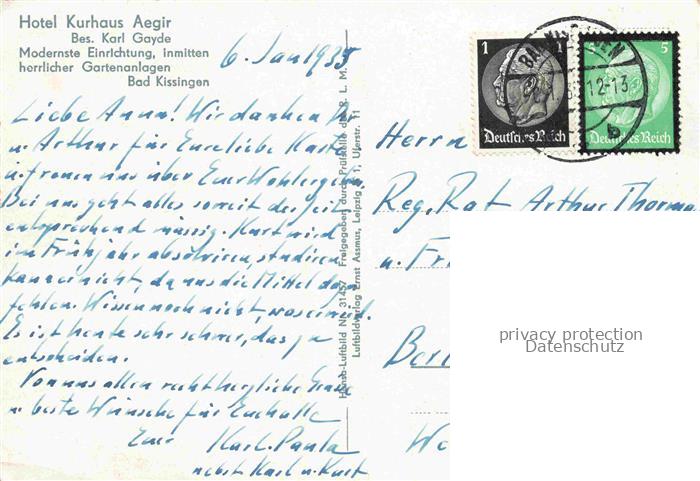 34146248 alte Postkarte BAD KIssINGEN Hotel Kurhaus Aegir Original Fliegeraufnahme postalisch gelaufen Erhaltung siehe scans [FriedD77] KatCode: 11110009672114