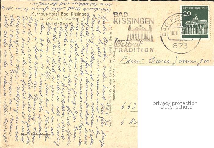 72112643 alte Postkarte Bad Kissingen Kurhaus Hotel Bad Kissingen postalisch gelaufen Erhaltung siehe scans KatCode: 11110009672114