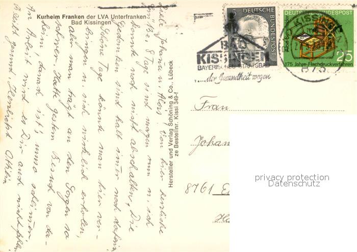 73647965 alte Postkarte Bad Kissingen Kurheim Franken der LVA Unterfranken Gastraeume Treppenaufgang Wasertreten Fontaene Postkutsche postalisch gelaufen Erhaltung siehe scans [WerneD78] KatCode: 11110009672114