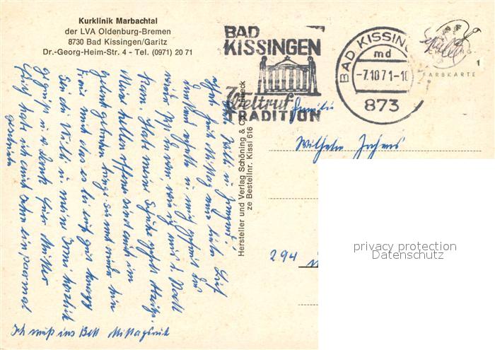 73104631 alte Postkarte Bad Kissingen Kurklinik Marbachtal postalisch gelaufen Erhaltung siehe scans [WerneD78] KatCode: 11110009672114