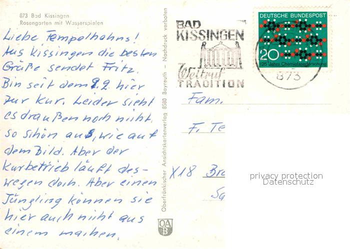 72848804 alte Postkarte Bad Kissingen Rosengarten mit Wasserspielen postalisch gelaufen Erhaltung siehe scans [FriedD77] KatCode: 11110009672114