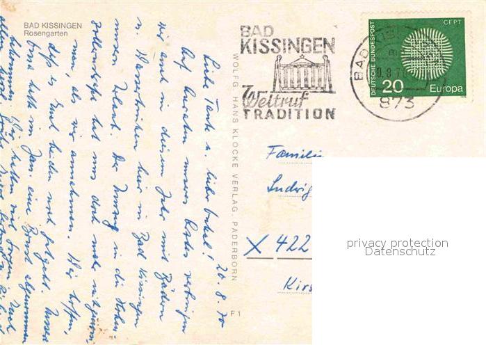 72860167 alte Postkarte Bad Kissingen Rosengarten Wasserspiele postalisch gelaufen Erhaltung siehe scans [FriedD77] KatCode: 11110009672114