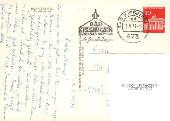 73787737 alte Postkarte Bad Kissingen Schwimmbad postalisch gelaufen Erhaltung siehe scans [FriedD77] KatCode: 11110009672114