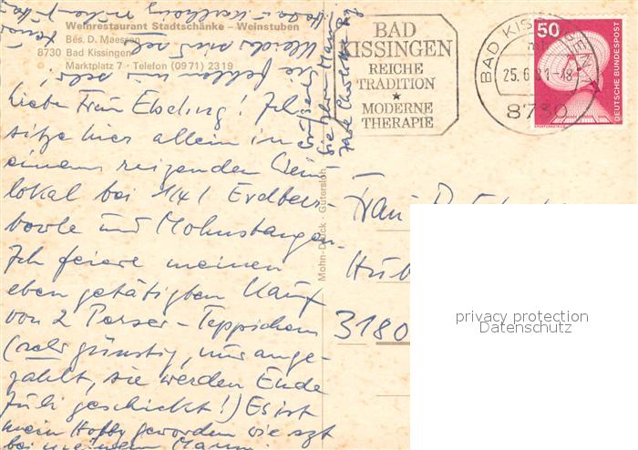 73651881 alte Postkarte Bad Kissingen Weinrestaurant Stadtschaenke Weinstuben postalisch gelaufen Erhaltung siehe scans [WerneD78] KatCode: 11110009672114