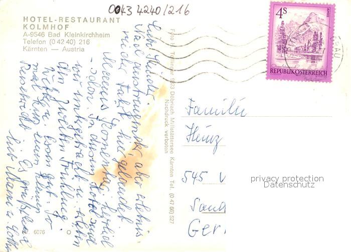 73219959 alte Postkarte Bad Kleinkirchheim Kaernten Hotel Restaurant Kolmhof Blick ins Tal postalisch gelaufen Erhaltung siehe scans [FriedD77] KatCode: 11390212020601