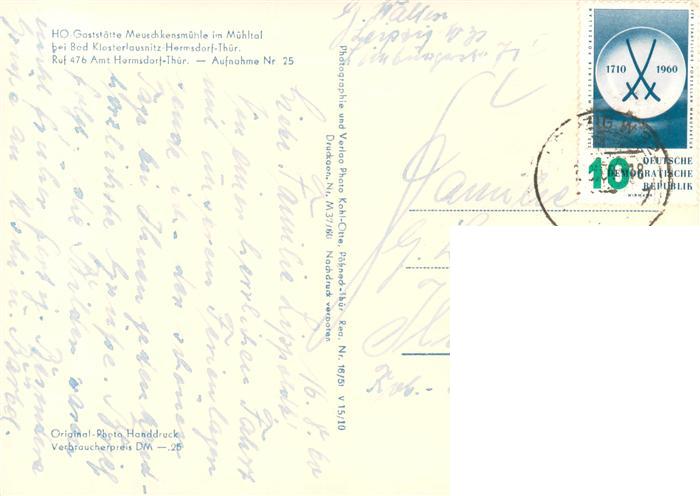 73874932 alte Postkarte Bad Klosterlausnitz HO-Gaststaette Meuschkensmuehle im Muehltal postalisch gelaufen Erhaltung siehe scans [FriedD77] KatCode: 11110016074003