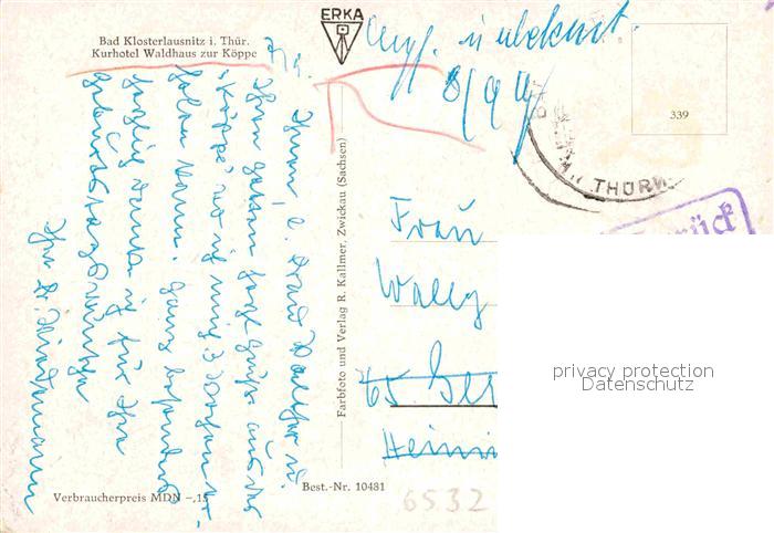 72775004 alte Postkarte Bad Klosterlausnitz Kurhotel Waldhaus zur Koeppe postalisch gelaufen Erhaltung siehe scans [NatalD47] KatCode: 11110016074003
