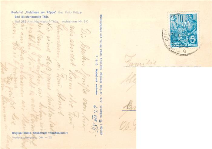 73887408 alte Postkarte Bad Klosterlausnitz Kurhotel Waldhaus zur Koeppe postalisch gelaufen Erhaltung siehe scans [WerneD78] KatCode: 11110016074003