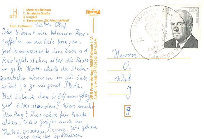73876656 alte Postkarte Bad Klosterlausnitz Markt mit Rathaus Jenaische Strasse Kurpark Sanatorium Dr Friedrich Wolf postalisch gelaufen Erhaltung siehe scans [WerneD78] KatCode: 11110016074003