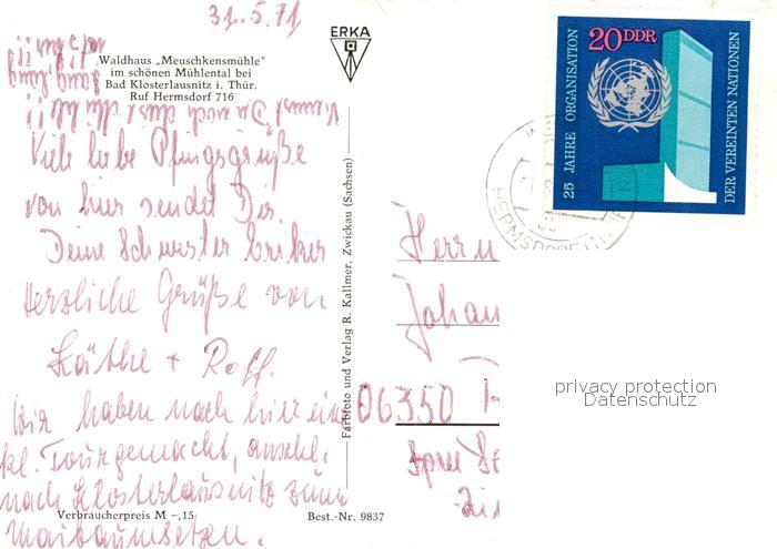 73205076 alte Postkarte Bad Klosterlausnitz Waldhaus Meuschkensmuehle postalisch gelaufen Erhaltung siehe scans [NatalD47] KatCode: 11110016074003