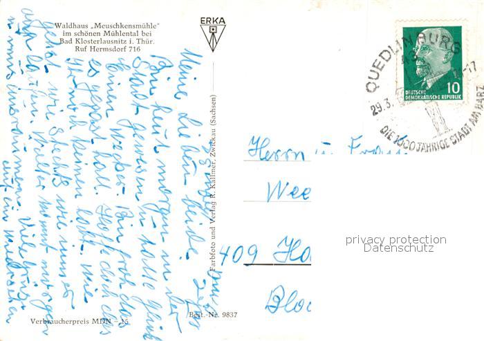 73613963 alte Postkarte Bad Klosterlausnitz Waldhaus Meuschkensmuehle postalisch gelaufen Erhaltung siehe scans [FriedD77] KatCode: 11110016074003