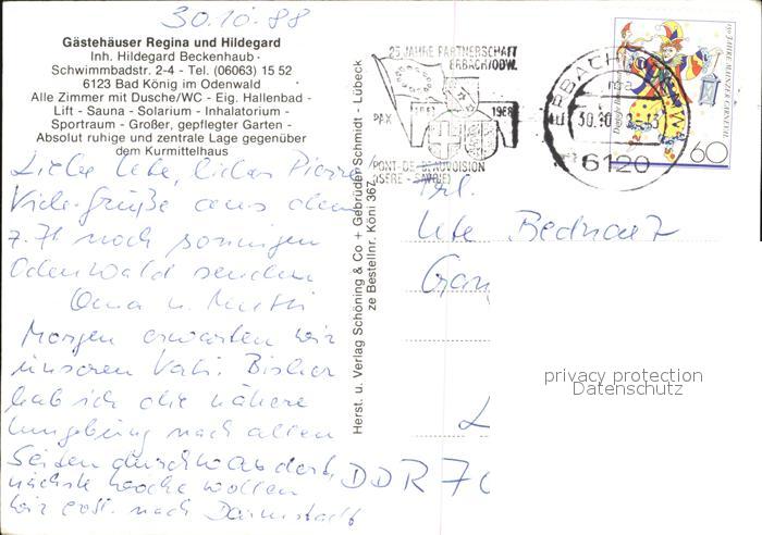 alte Postkarte Bad Koenig Odenwald Gaestehaeuser Regina Hildegard postalisch gelaufen Erhaltung siehe scans