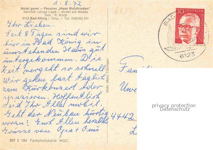 74044769 alte Postkarte Bad Koenig Odenwald Hessen Hotel garni Pension Haus Waldfrieden postalisch gelaufen Erhaltung siehe scans [WerneD78] KatCode: 11110006437001