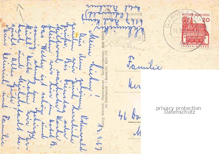 74104653 alte Postkarte Bad Koenig Odenwald Hessen Odenwaldsanatorium Eingang Haus Bodmann Landhaus Batzenhaus Schwalbennest Waldeck Wasserspiele Haus Rose postalisch gelaufen Erhaltung siehe scans [WerneD78] KatCode: 11110006437001